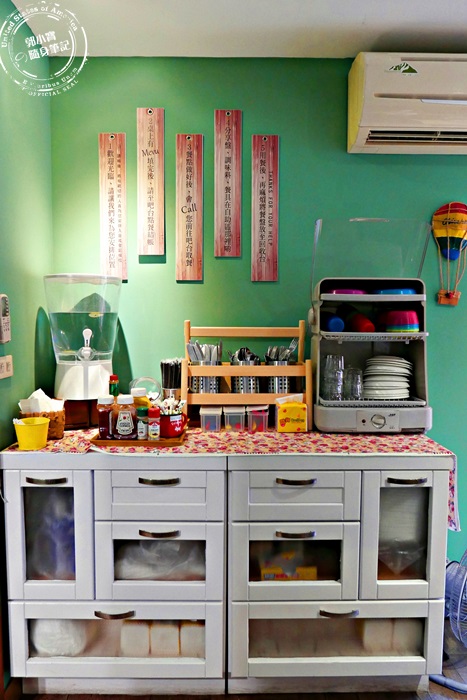 餐具、調味料、白開水,全部東西通通在這裡,非常的齊全應有盡有而且很乾淨,牆上還有教戰守則,就是來這裡點餐用餐步驟,自助自取式,客人自己動動手來,過程中一點也不雜亂。 |