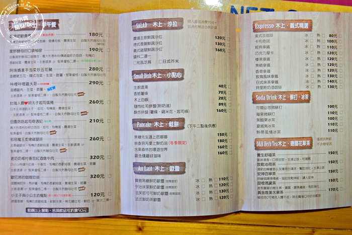菜單以早午餐居多,點早午餐再搭配飲品可以折$50,其實蠻划算的,有些店家可是沒有優惠唷!其他的沙拉、鬆餅、點心也都有,反正他們家就營業到下午五點而已,提供的餐點整天都能吃,除了晚餐。 |
