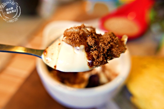 餐點附的優格,店家一直強調這個優格要先吃,耳提面命的就是怕像艾編這樣一直顧著聊天沒有吃,店家在出餐的時候才在上面撒上黑糖,要趁黑糖還沒有完全化掉趕緊吃,這是店家很自豪的手工優格,真的跟一般吃到的優格不一樣,香氣跟酸甜滋味在嘴裡呈現,配上黑糖香甜,加上堅果帶來口感上的豐富層次,太美妙太舒服了,突然覺得只有一點點不夠吃。 |