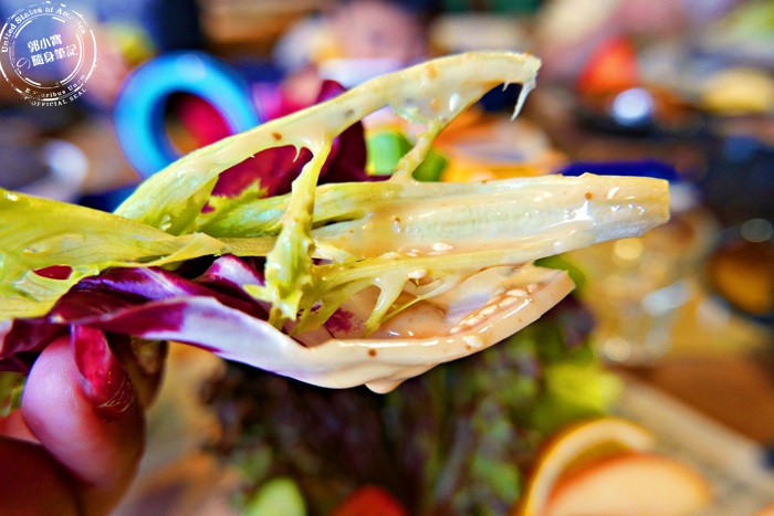 生菜的部分搭配店家特製的的胡麻醬,香氣濃郁厚實,微微的酸度實在很帶勁,味道爽口開胃,真的很配生菜的脆甜,艾編狂沾到最後醬汁不夠吃啦! |