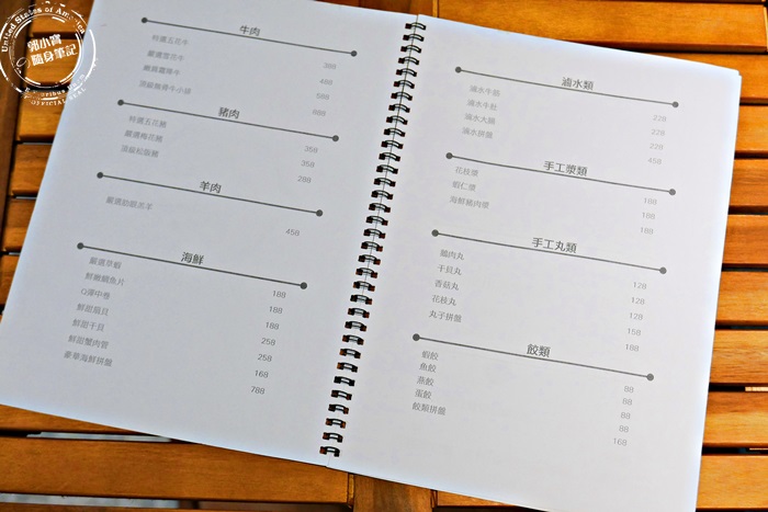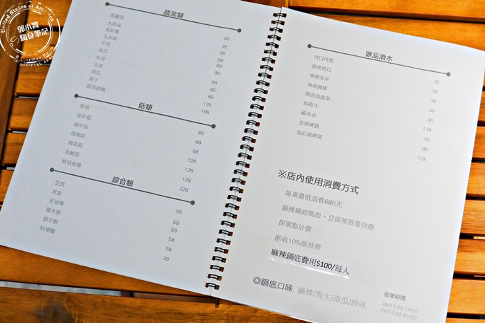 店家說這是他們家的臨時菜單,所以整個這樣白白的就是一般的A4紙,跟他們家的裝潢比起來菜單顯的較不襯,之後就會換菜單了,他們家是單點的麻辣鍋,鍋底的部分有麻辣/養生/南瓜/原味,如果有點麻辣的,人頭一人收$100,其他想吃的火鍋料就直接點,價錢其實不是很貴,跟一些知名的麻辣鍋相比,他們家實在是太平價了。 |