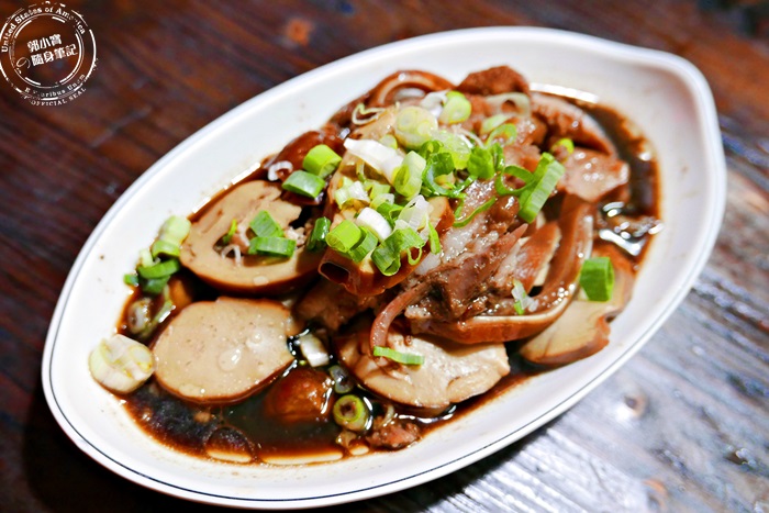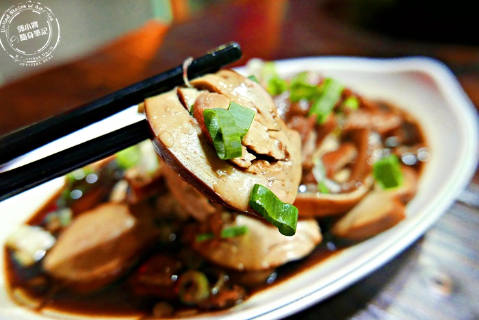 滷味拼盤店家會自己挑選幾樣,然後拼出幾種給客人挑選,選喜歡的跟老闆娘說,老闆娘加熱後才送上桌,光是看到送上桌的畫面都要流口水了,這個素雞是豆類製品,像是豆干不過是一圈圈的捲起來,口感還不錯,最外層就是跟豆干一樣稍微的有Q度,裡頭的部分比較柔軟,而且豆香味十足,加上滷汁的鹹香跟蔥花的香氣,這小菜吃起來就是舒服滿足呀! |