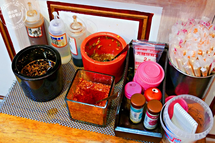 出餐口前方的小桌子,擺滿各種調味料,還有店家手工炒的辣椒,老闆娘都會建議客人一定要加,用多一點也無所謂,沒在怕客人吃,艾編有試試味道,真的很香很舒服的辣唷!嘴裡麻麻的感覺好讚,真的不會辣到不要不要的,沒有過量都很可以唷! |