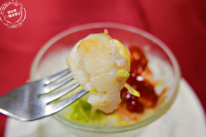 這盤非常超值,干貝比剛剛的冷盅明顯大很多,品質超好,外面的煙燻鮭魚略有厚度,包裹住干貝,厚實柔軟的口感及香氣讓人好滿足,切開一口吞,好飽足的份量,大海的鮮美在舌尖柔軟而舒服,調味來自上面那一粒粒的點綴,賦予鹹度,中和起來的味道極為幸福。 |