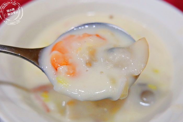 味道很香濃卻不膩口,滿滿的海鮮超豐富,有蟹肉、蛤蠣肉,鮮蝦一整隻,蛤蠣真的超飽滿,光吃蛤蠣都覺得滿足,配料一極棒,覺得濃湯也是頗厲害的,很用心很講究。 |