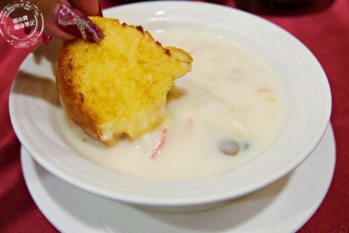 蒜香麵包搭配濃湯最對味了,真的超喜歡這樣的吃法,一個麵包能有這麼多種的享受,實在是很滿足,蒜味的鹹香配上鮮美濃湯,瞬間胃口大開,已經不管什麼形象了,就是要這滿滿的大蒜味。 |