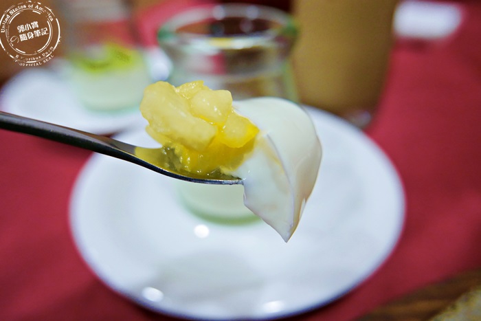 今天的精緻甜點是水果奶酪,這個是搭配鳳梨,都是使用新鮮水果切丁,酸酸甜甜的再配上奶酪的香濃以及鮮奶的香醇,冰涼香甜的滋味真的好舒服,雖然只有一點點,但是已經很滿足了。 |