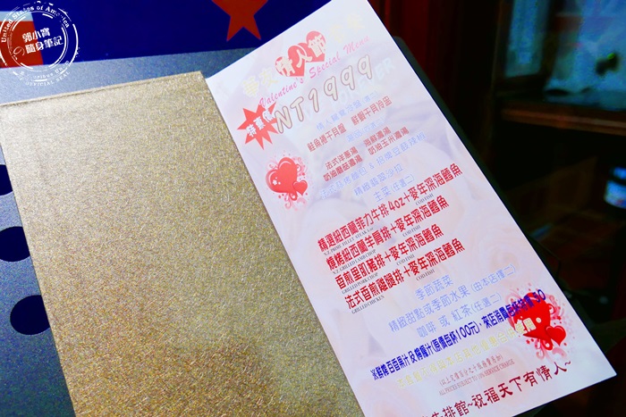 情人節有專屬的套餐可以選擇,其實蠻划算的,光是主餐的部分,原價就$990了,雙人情人餐還有附冷盤,而且麵包、湯品、沙拉、甜點、飲品也通通都有,一整套這樣相當的划算唷!艾編今晚選擇的就是情人節套餐組合$1999,需加收一成服務費。 |