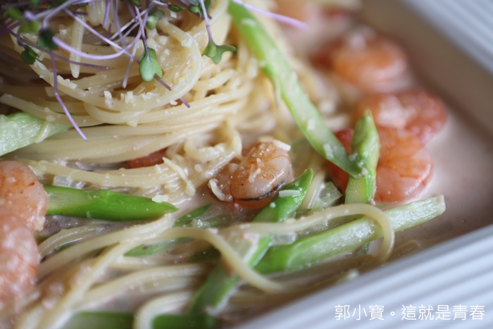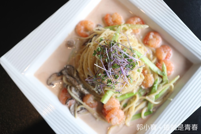 這一款義大利麵是我朋友點的,因為她個人非常熱愛蝦子,所以看到太蝦就立馬點下去了,雖然不是白蝦或是草蝦,但是光是看到一整盤滿滿的蝦仁也很過癮,它們家的蝦仁塊頭也不小,重點口感非常好彈牙鮮甜的蝦仁讓你每一口真的都有滿滿的蝦味,蘆筍挑選的也很新鮮,清脆清甜。 |