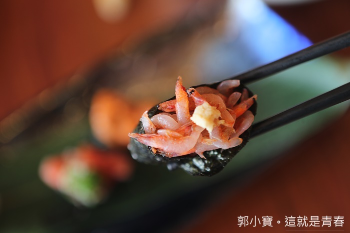 東港名物櫻花蝦,活跳跳新鮮的櫻花蝦作成軍艦我還是第一次看到,一口放入嘴裡咀嚼力馬可以感受到櫻花蝦的鮮甜跟獨特香氣,非常特別的櫻花蝦軍艦。 |