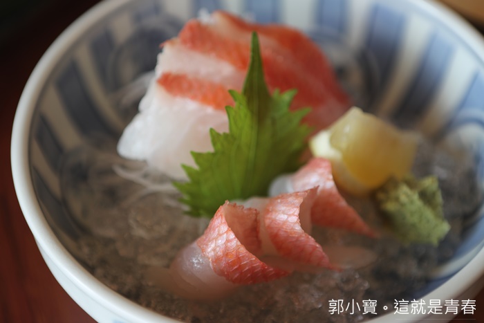 喜知次和金目鯛大概是日本人最愛吃的兩種魚類,所以有金目鯛的生魚片當然不能放過,生魚片搭配的芥末是阿里山現磨的山葵,品質非常好。 |