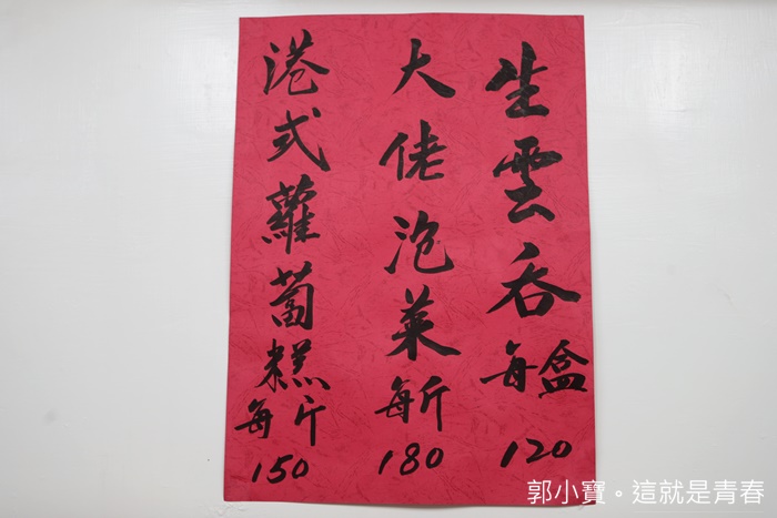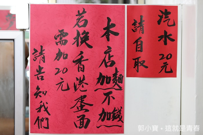 不知道是不是香港人的文法我不是那麼懂,加麵不加錢聽起來有一點點饒舌,還有菜單上的價位都是台灣麵條的價位,如果要換香港蛋麵需要另外加20元,真心建議大家一定要換蛋麵,不然就枉費來這邊吃麵了,旦是如果換成蛋麵加20以後我也要加麵不知道是不是也不用錢? |