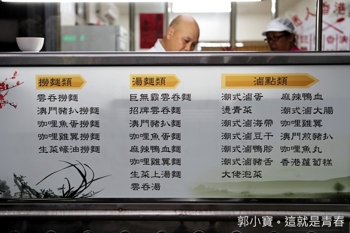 看了一下菜單,主要分為乾麵跟湯麵,香港的乾麵稱為撈麵,湯麵的口味較多,這些品名組合的麵種都是我第一次看到,除了雲吞麵以外XD |
