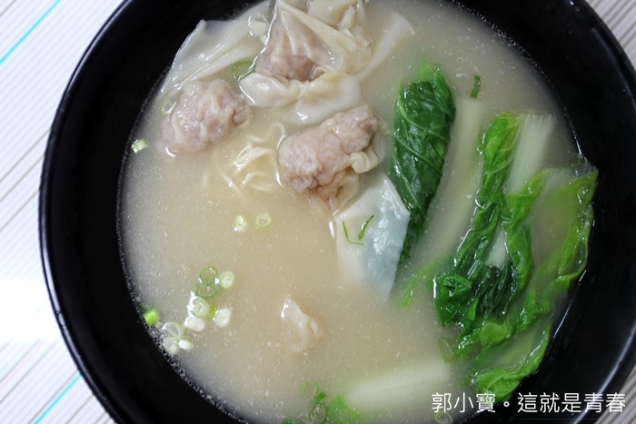 可已看到每一顆雲吞都很飽滿,大約數了一下裡面有4.5顆雲吞的樣子,內餡都很紮實以外,還可以看到裡面的豬肉都還是呈現粉紅色的狀態,就是新鮮的豬肉,這樣看起來我覺得一碗80元真的還滿便宜的。 |