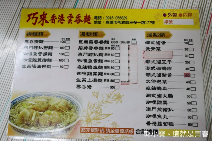 巧來香港雲吞麵是我超推薦的麵店,我個人非常熱愛麵食,高雄大大小小的麵店我少說也吃了百來家,大部分有名的麵店我都品嘗過了,但是唯獨這一家巧來香港雲吞麵最讓我驚豔,其實高雄的麵實在我心裡面我個人覺得很強,即使全台灣四處跑透透,我還是覺得高雄麵食保留最完整,尤其是再鳥松赤山一代的外省麵食,更是一絕讚不絕口,大部分高雄隨便找一家都有基本水準以上,但是巧來香港雲吞麵我吃完後就馬上整理照片跟大家分享,這絕對能顛覆妳想像的好味道!!!! |