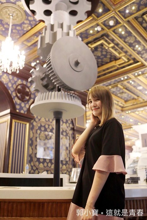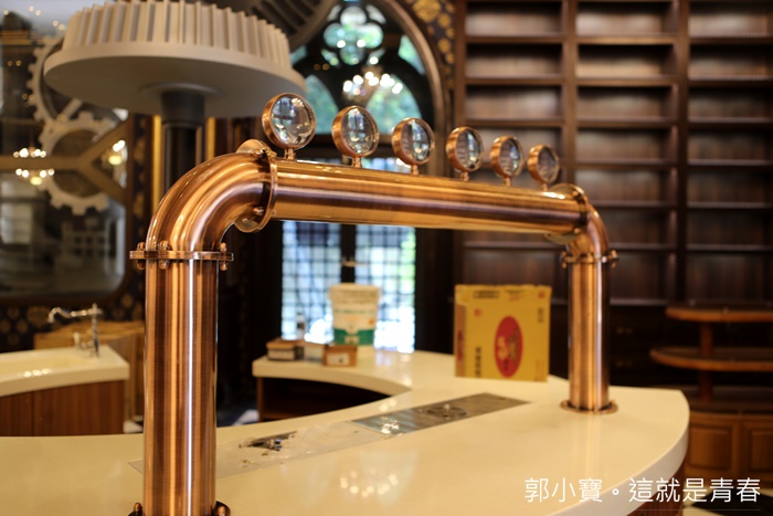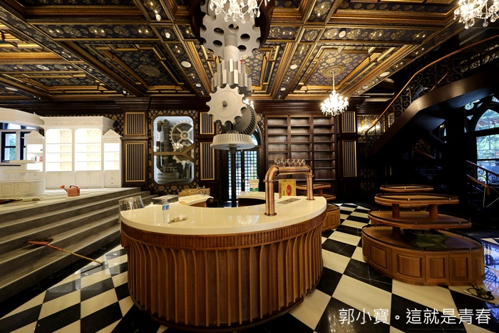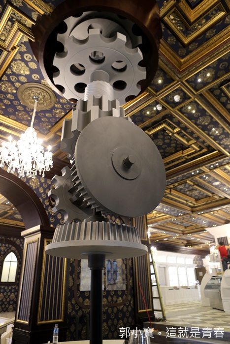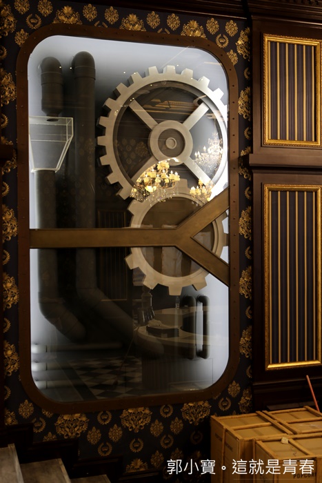 巨大的齒輪立柱滿壯觀的,還有一旁古銅色的鐵管目前還看不出來她的作用,這邊應該是飲料吧檯?該不會還有賣啤酒吧,真的還滿有趣的,讓人流連忘返的美景。 |