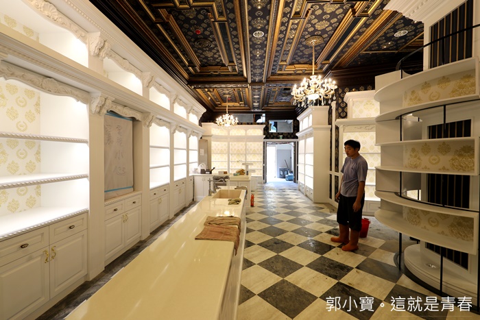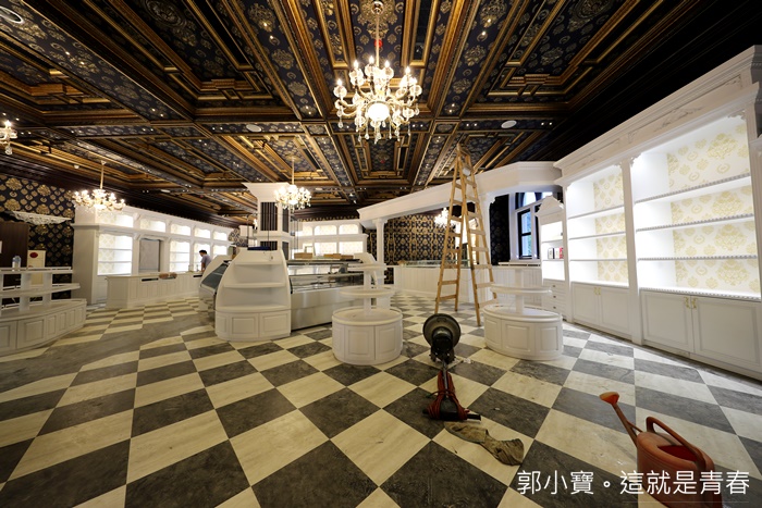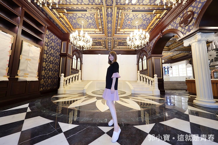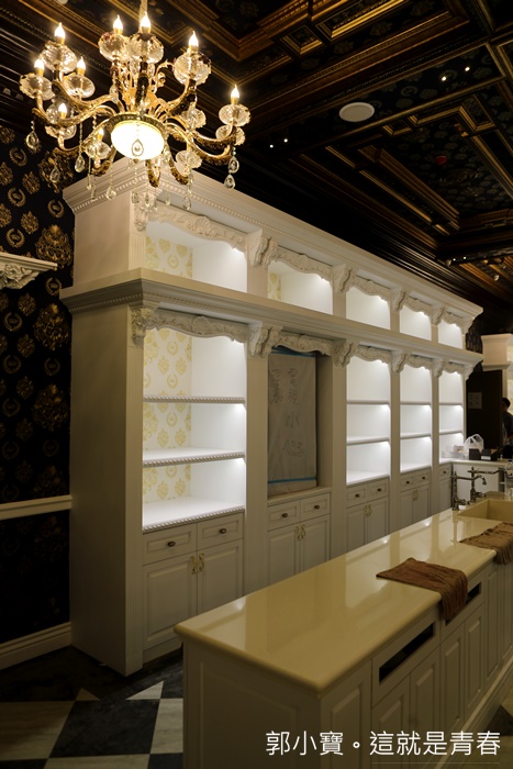 往後方繼續走去才發現內部空間也超大的,後方一整個就是讓人少女心爆發的地方,白色的櫥櫃跟超美的大吊燈,金碧輝煌的天花板搭配黑白相間的方格地板,好美! |
