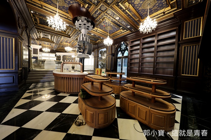 一樓的大廳非常的大,一樓主要都是商品部,販售妮娜的巧克力相關商品為主,這根本也太美了,不管是吊燈還是壁紙都挑選的超漂亮的,就連男生也會少女心大開,彷彿走進了歐洲古典城堡般,就差了一條紅地毯了。 |