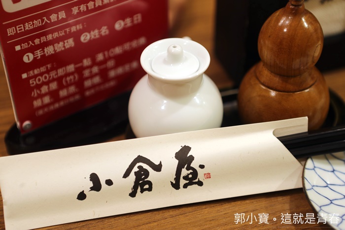 入座的時候可以感受到店內的員工訓練都還滿好的,不管在服務上還是招呼上都很親切也滿專業的,除了基本的筷子以外,桌上擺放的調味料只有花椒跟醬油,小倉屋的醬油都是採用台灣百年老鋪丸莊醬油! |