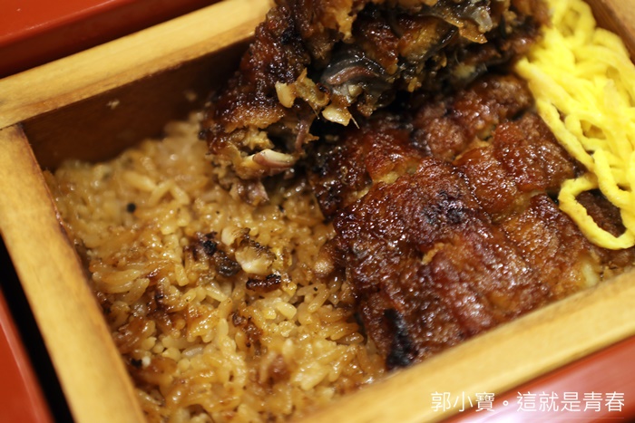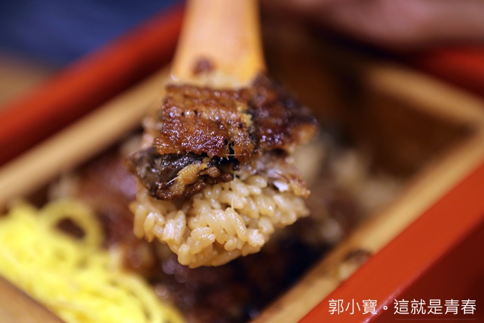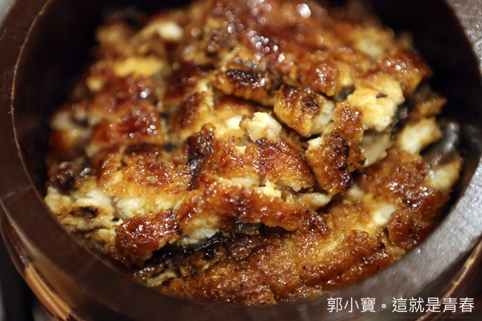 將鰻魚翻開後就可以看到裡面的米飯,米飯的部分醬色入的更深了一些,可能是因為最後蒸10分鐘的關係所以混合的完整,米飯吃起來又稍微軟了一些,吃起來的口感有點像是釜燒飯,悶這十分鐘真的還不賴,吃到最下面還有木頭的香氣,難怪讓田舍庵可以一舉成名的招牌商品。 |