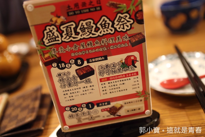 看到這桌上的立卡讓我眼睛馬上為之一亮,到2018年8/19號以前鰻魚定食全面自動升級一個尺寸,而且滿千還可以參加抽獎,頭獎除了可以得到兩人福岡來回機票以外,還送你去田舍庵本店吃鰻魚,本來活動只到8/8號,但是因為反應很熱烈,所以延長到19號。 |