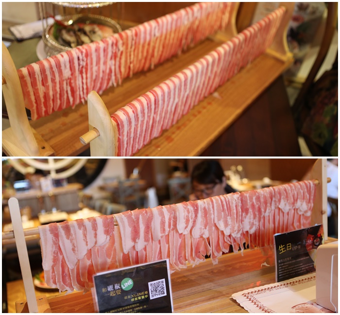 當天中午就有兩組壽星來用餐,有一組就是7x幾歲的阿嬤過生日,現場送上兩大排的牛肉瀑布真的很誇張,這兩大排的牛肉衣送來就真的不用在點肉了,全家一起吃都划算,下面一排是我隔壁桌的男生,上面的肉品可以自由選擇你要牛肉還是豬肉。 |