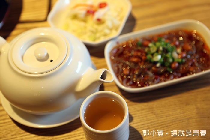 開鍋附贈的養生熱茶跟小菜、涼粉,養生茶是可以續加的。 |