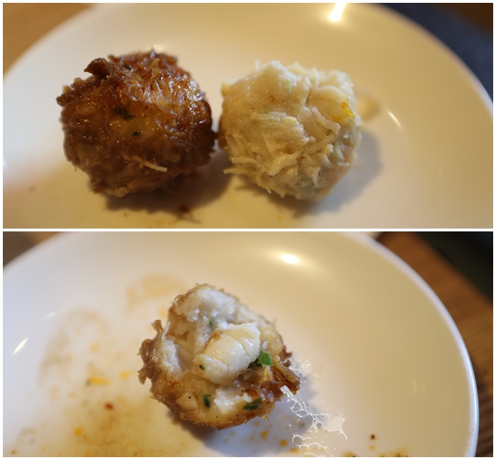 這也是我第一次看過這樣的干貝丸,干貝絲黏得滿滿的丸子外層,我個人兩邊的鍋都有下兩顆,吃完後我覺得比較適合下再白湯,麻辣鍋會把干貝的香氣幾乎都蓋走,但是入白鍋煮完後入口可以吃到干貝的香氣跟丸子本身的彈牙,裡面還有超大塊的花枝塊,非常過癮!!!! |