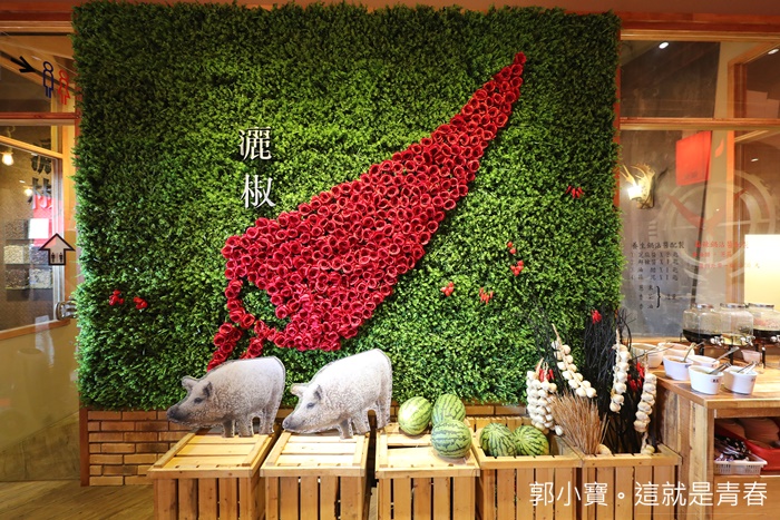 重點是還有一大面的植栽牆,上面就組成一幅辣椒的圖像,紅色根綠色的搭配是最搶眼的搭配,下面還有各式各樣的小道具提供給消費者來個自拍,沒有錯,就是俗稱的網美牆,特別顯眼的是一旁有兩隻豬的畫板,這兩隻豬搞的跟羊一樣全身都是毛,後來才知道這是店家的招牌綿羊豬XDDDD |