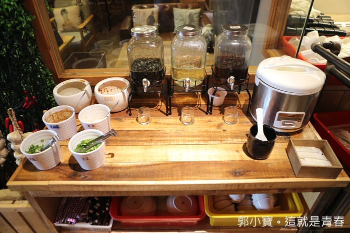 一旁的櫃子是自助醬料區,整理的非常乾淨,底下是備用的碗碟區,白飯是免費供應的。 |