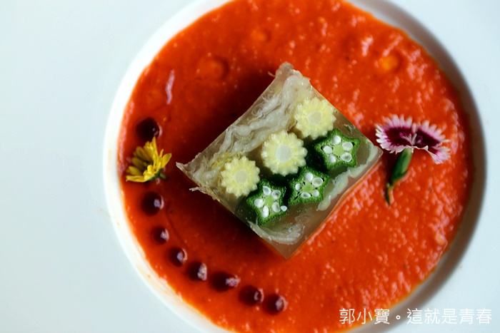 切下一小口蔬菜凍沾上醬汁入口,鮮甜的蔬菜及秋葵的滋味充滿嘴裡,醬汁基本上沒有太多的搶味,淡雅的滋味讓人真的一整個胃口大開! |