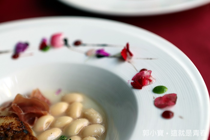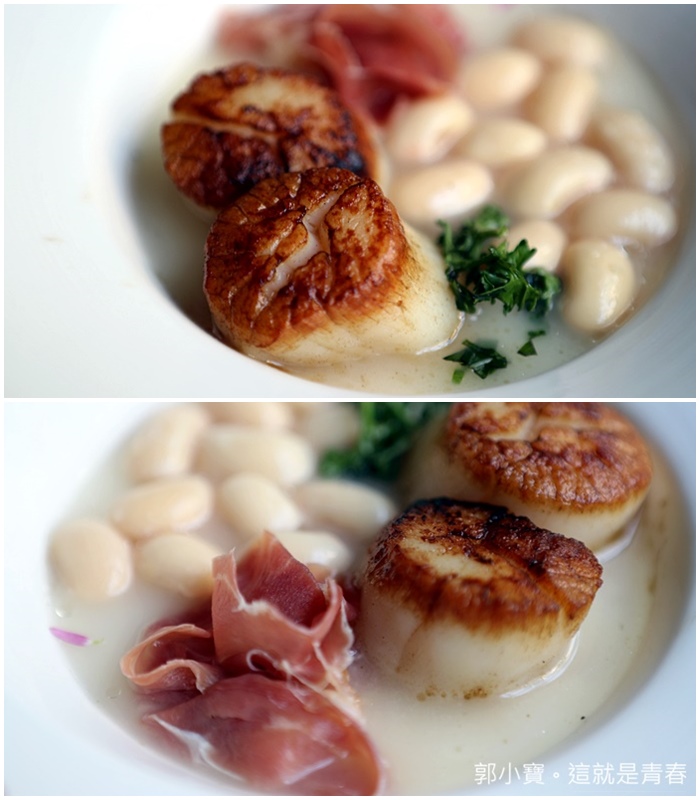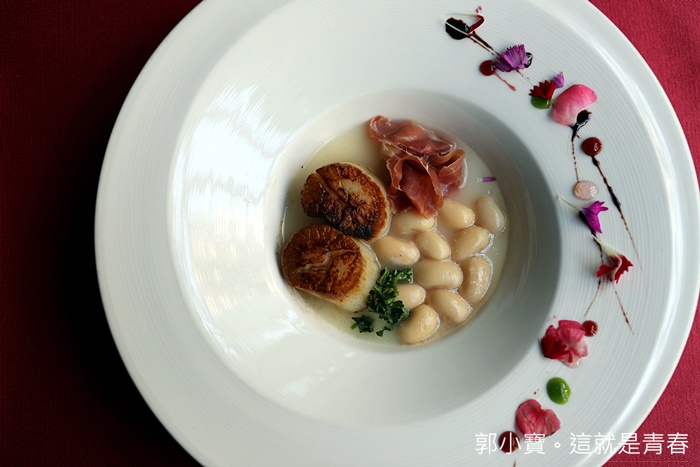 經過工作人員的提醒我才記起來他是一道湯品,因為我整個眼光都在大干貝跟火腿上,干貝先炙燒過色澤非常的美味以外,加上義式生火腿更顯得可口,搭配埃及豆的甜味,每一口都是非常極致的享受,大骨上白湯溫潤順口,整體的風味都拿捏得相當好,才第二道菜就有大干貝真的有點太爽了XD |