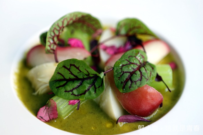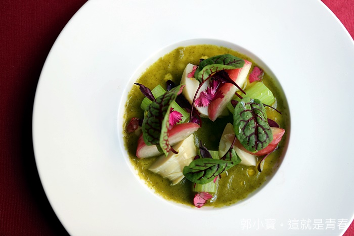 沙拉的部分也很美,這次每道菜的視覺上主廚都下了很足的功夫,蓮霧、冬筍、西芹這散樣我從沒想過可以搭配在一起,蓮霧的多汁加上冬筍的鮮甜還有西芹的青脆口感,搭配香芹醬汁一整個非常的爽口。 |