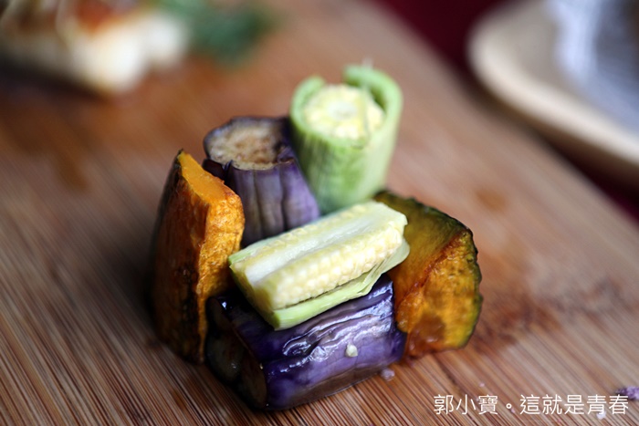 搭配的蔬食是玉米筍、茄子跟南瓜,主要色彩搭配的很豐富,看起來讓人食指大動。 |