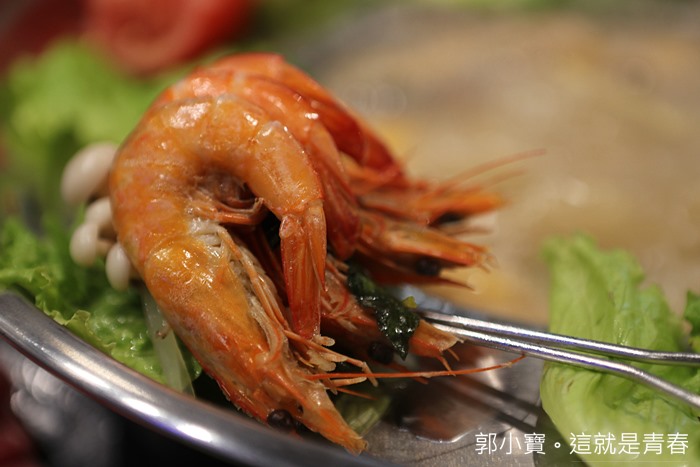 白蝦的品質也很好,鐵帽鍋裡面本來就有三隻蝦子,還貼心的用牙籤串起來,煮熟後可以先撈起放在鍋緣保溫,白蝦的肉非常彈牙且又鮮甜。 |