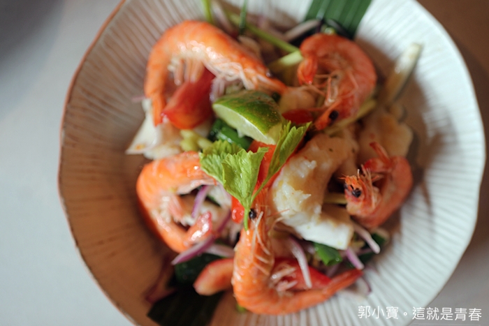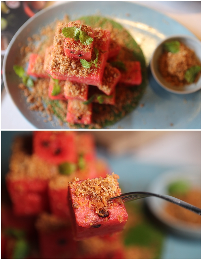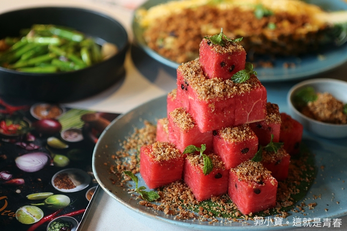 這一道我個人是認為必點的菜色,因為是道道地地的泰北菜,也是我第一次在台灣看到有餐廳願意費工的推出這一道菜,加上台灣的水果真的品質很好,老實說不管是西瓜還是芒果,我個人都認為台灣的優於泰國的品質,不管是香味還是甜度都是台灣的比較好,所以WOO使用台灣的香甜西瓜搭配魚酥,入口那西瓜的多汁鮮甜還有魚酥的鹹甜及帶點顆粒的口感,跟西瓜搭配起來那口感真的很討喜。 |