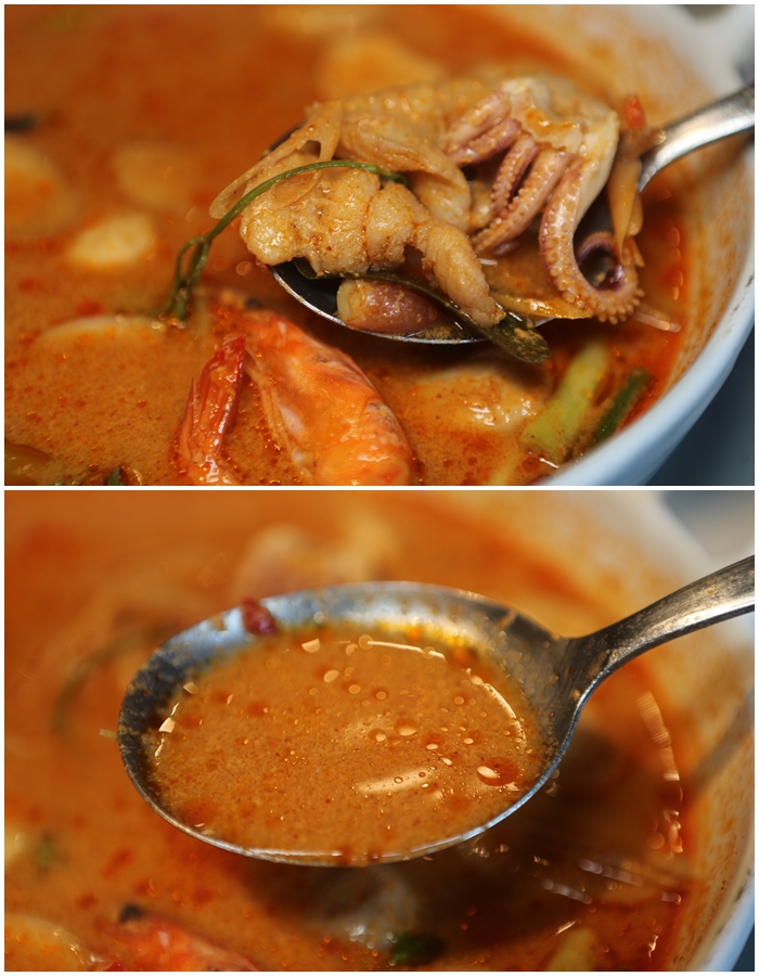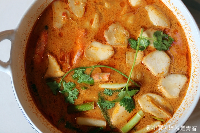 這大概是我在台灣喝過最好喝的冬蔭功了,入口後它的層次感相當的豐富,一層一層的透出來,每一種滋味妳都可以細細地品嘗出來,椰奶的香、香料的豐富、些微的酸甜、辣的後勁,是非常紮實的冬蔭海鮮湯,我甚至認為它比泰國當地很多的冬蔭功還要好呵!! |
