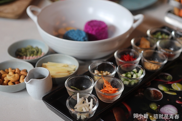 先把全部的配料逐一放進碗裏面,一燥順序排列好,小黃瓜丁、長紅豆、葡萄柚、胡蘿蔔絲、椰子酥、蝦米酥、青檸葉、香茅、豆芽菜、豆棗、辣椒粉、胡椒粉超多配料及辛香料。 |