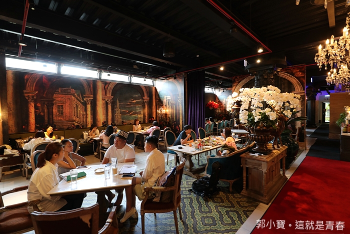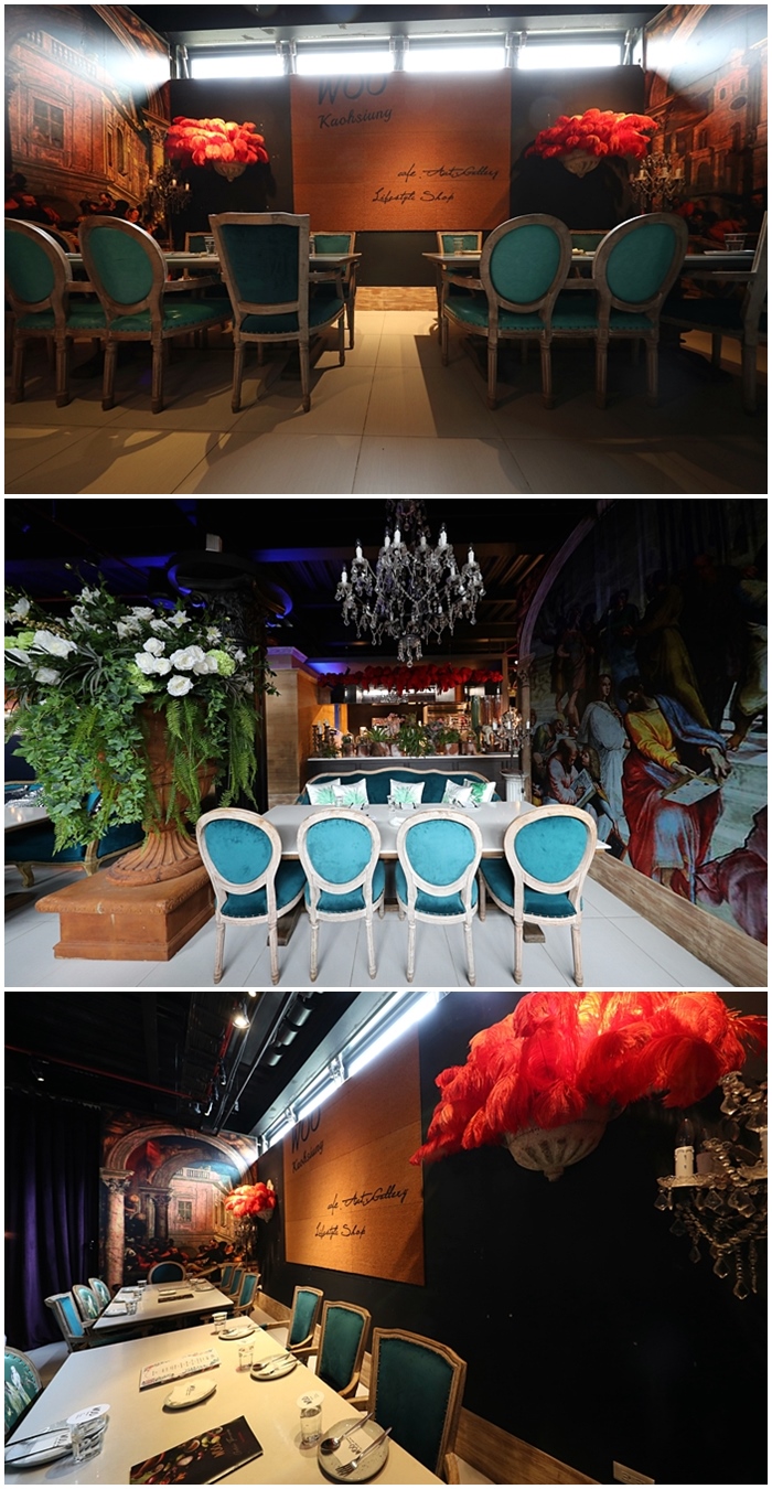走進店內又讓我們不禁的WOO~~~~了好幾聲,走到這裡才真正了解為什麼店名為取WOO,店內的空間挑高所以不會有壓迫感,加上光線的交錯很有感覺,還有精熙佈置的小細節,每個角落都是拍照的好景點,宮廷風的壁畫、天花板上的水晶吊燈、門口的巨型蠟燭桌、店內的大型園藝盆栽都美到一個不行。 |