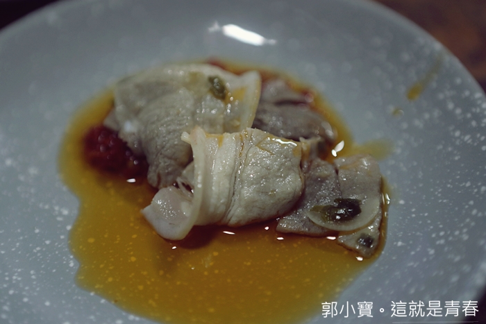 脆皮豬肉片是今天隱藏版食材,所以我就順手點了一份,這脆皮豬肉片看起來就很厲害,挑選的部分我也覺得很特別,尤其油脂的部分為什麼咬起來那麼脆口,真的很好吃,重點是沒有豬腥味。 |