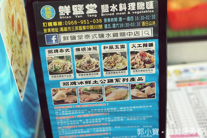 這天回高雄的時候經過鼎中路與金鼎路口就瞄到了這邊也有一家鮮鹽堂鹽水雞,瞬間就吸引我的目光,所以繞回頭了看看,因為她們家每一家分店都有獨自的隱藏版料理,所以我對各分店的隱藏版食材都還滿有興趣的。 |