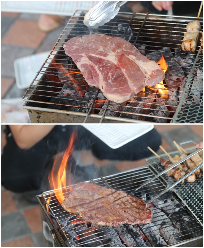 看看我們烤的根本就是跟居酒屋的燒烤師傅一樣的厲害了,那個色澤那個熟度我們拿貼得很好,因為五根烤肉網都把最適合燒烤的大小都分切好了,一串一串烤起來真的非常方便,牛肋條真的很好吃,瞬間每個人都人手一根把她嗑掉了。 |