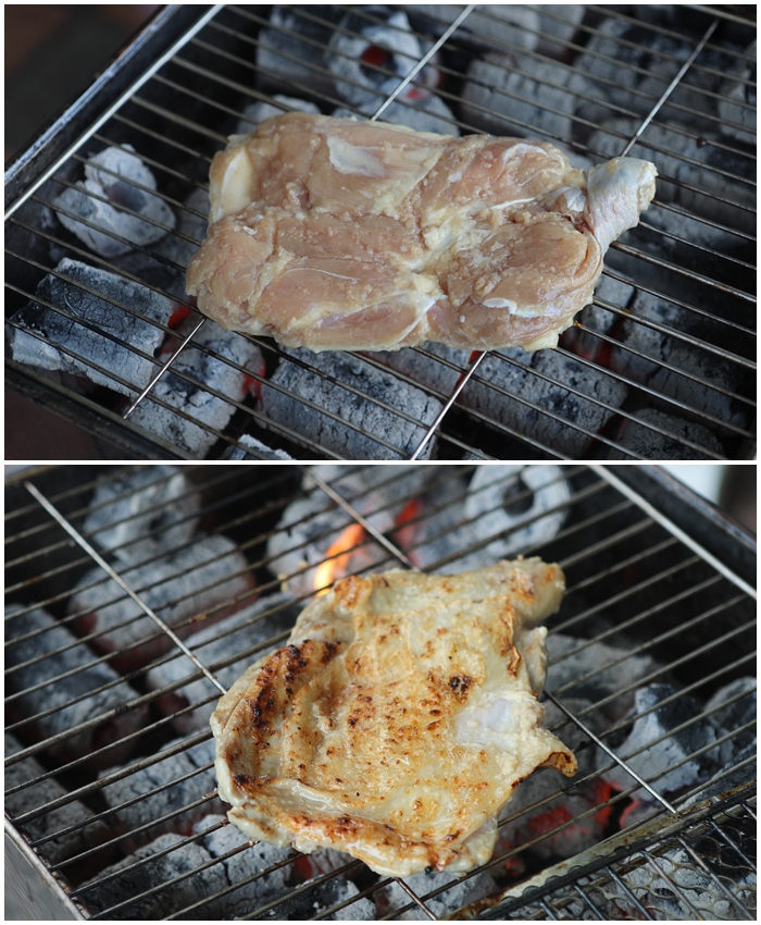 五根烤肉網的雞肉品質都很棒,一串一串的帶皮雞腿肉接上烤爐烤起來非常方便,因為分切過一塊一塊的雞腿肉串燒,受熱相當均勻,持續翻烤一下子就可以食用了XD |