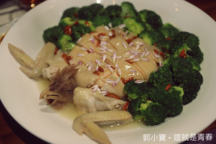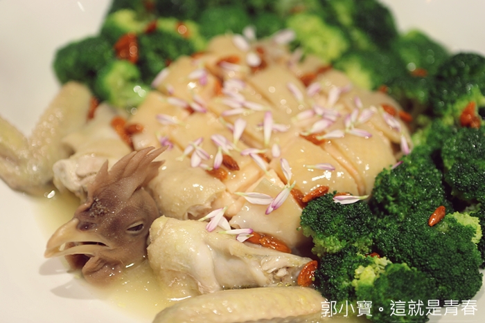 見雞不是雞、似雞又非雞就是這一道菜的經典之處,剛端上來的時候我還真以為她是一隻雞,夾起一塊雞肉才發現這根本不是雞肉,這一道菜堪稱手工菜,要將整隻雞去皮,皮不能穿不能破,整張雞皮去完如同一張布面,留下雞頭與雞翅,包入蝦漿後再進蒸籠蒸過,在剁成雞肉樣貌,淋上勾芡撒上蟹黃及花瓣方可上桌。 |