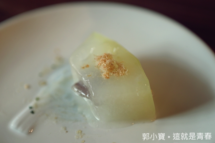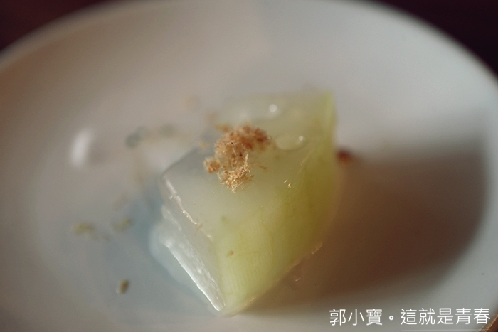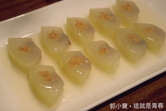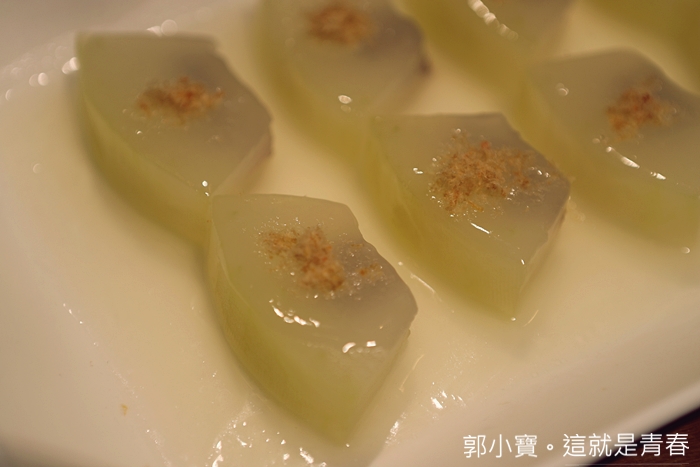 從沒想過冬瓜也可以做得那麼精緻,中間夾的是雲腿,雲腿在中國被稱為兩大名腿之一,與金華火腿齊名,雲腿就是雲南宣威火腿,冬瓜本身味道極為清淡,搭配雲腿的鹹度恰到好處,讓人忍不住一片接著一片。 |