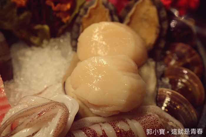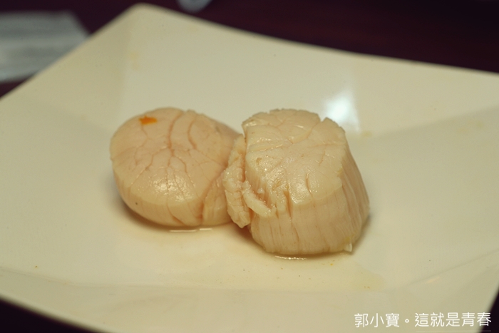 同樣也是生食級的大干貝,記得干貝也不要涮太久,不然會太老造成口感沒有那麼好,銅花的干貝除了碩大以外,彷彿都可以撕成干貝絲的視覺感很好,入口同樣十分滿意。 |