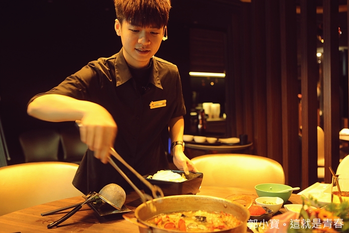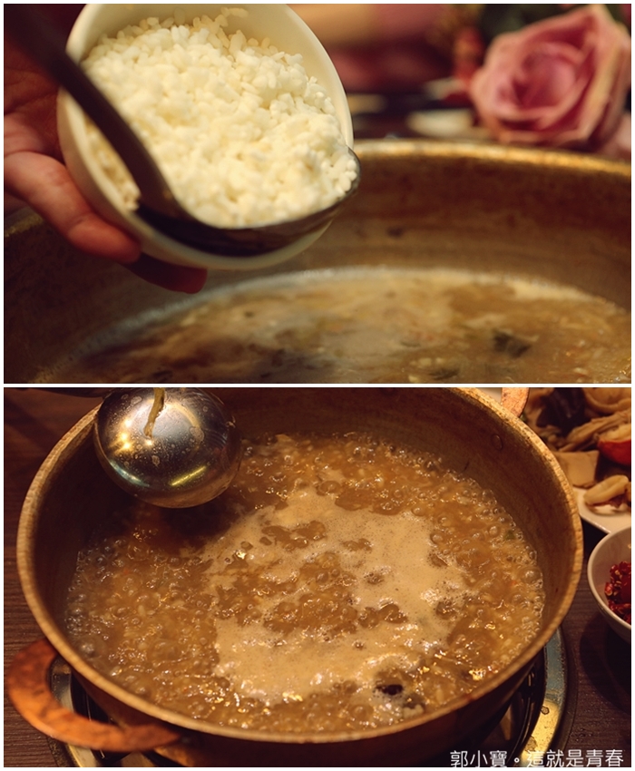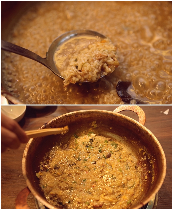 套餐最後的重點就是黃金稀飯了,服務人員會來幫鍋內的食材通通撈起,因為這一鍋高湯真的是超級精華,除了有牛肉以外還有超多生海鮮,所以拿來最雜炊真的非常適合。 |