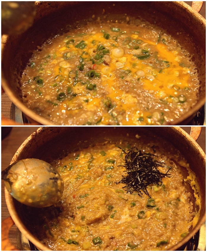 小火慢慢把高湯收乾,加上蛋黃跟紫菜絲、蔥花等,漸漸的香氣越來越濃郁,這一鍋雜炊真的用看的就知道超厲害!!! |