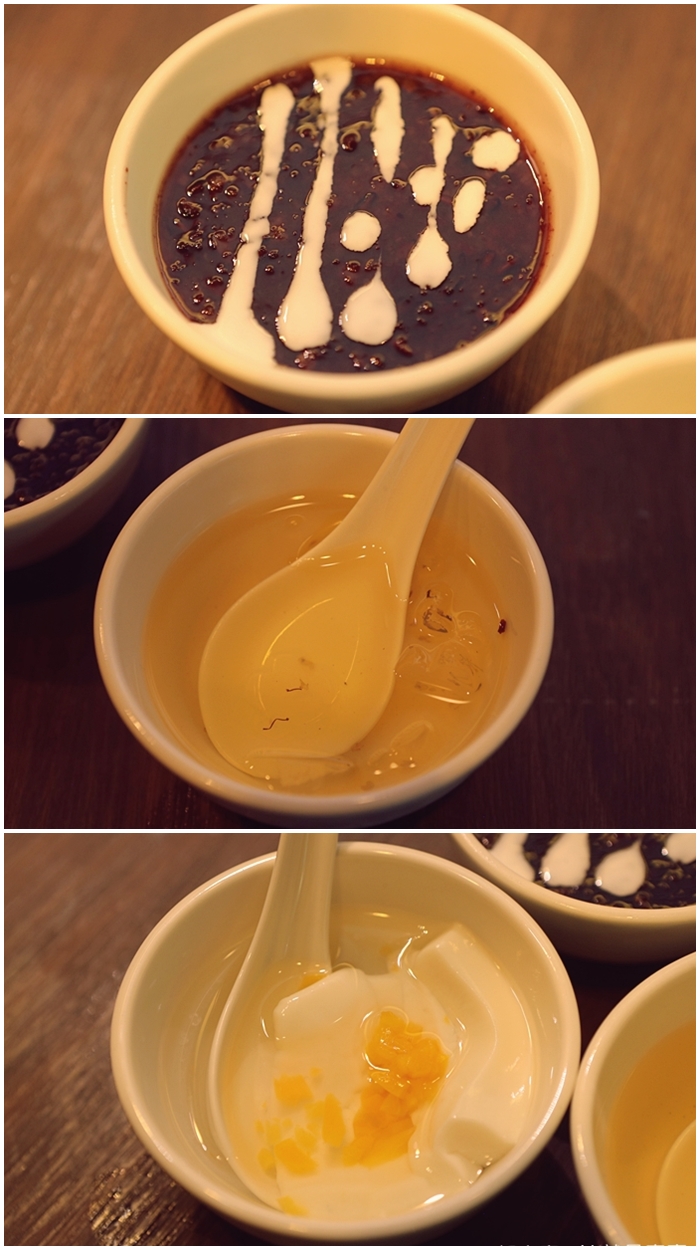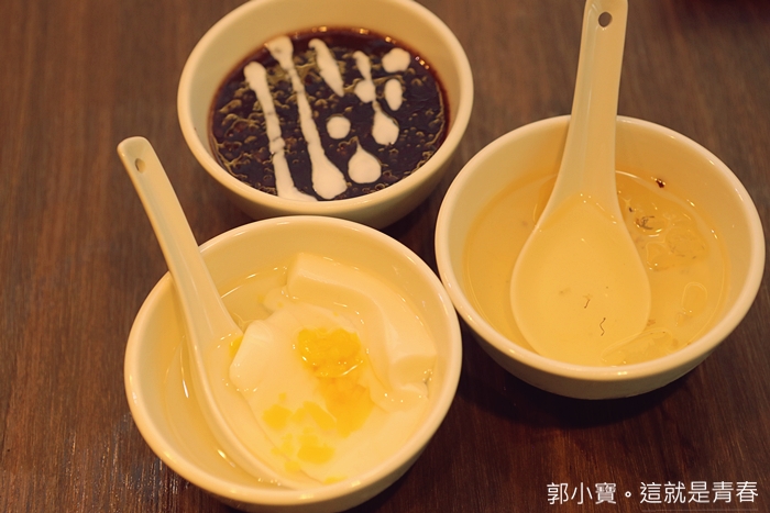 飯後甜點有三款,但是服務人員看到我們是一家三口,所以就一次把三種都上給我們品嘗了,銅花精緻涮涮鍋真的還滿大方地,看客人吃的開心就會開始招待,三款甜點都頗有水準,我家Cola對菜燕最捧場。 |