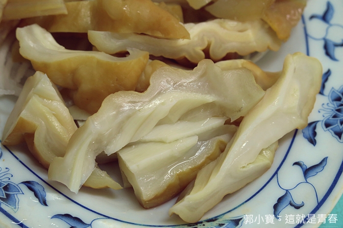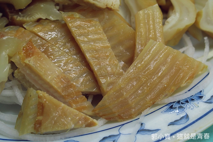 老闆娘說這是小鯊魚肉,吃起來跟平常吃的鯊魚烟口感不同,吃了一塊後的口感有點像是瘦肉的滋味,煙燻的味道重點了一點,沒有很多肉汁,但是上面的皮脂依然彈牙,口感比鯊魚烟更豐富許多。 |